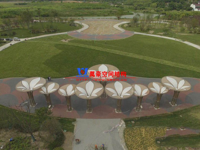 該項目膜結構共有9個單體結構,分別由1個大型花朵、4個中型花朵、4個小型花朵組成,膜結構建筑面積約為400平方米。