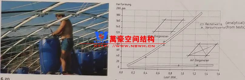 拉索被安排在桿件形成網格殼體以后張拉。經過試驗和計算分析,可以看到,增加拉索后結構的變形大大減小。