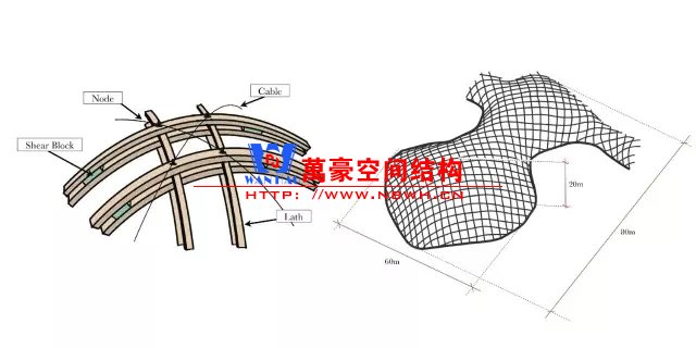 最終形態與初始形態相比,原來的正方形網格轉變為菱形。同時,單根5cmx5cm木條剛度很小,允許發生足夠大的彎曲變形。在達到設計形狀后,需要修整外殼的邊緣;并且在菱形網格中增設交叉拉索,使柔軟的網格成為堅固的結構。