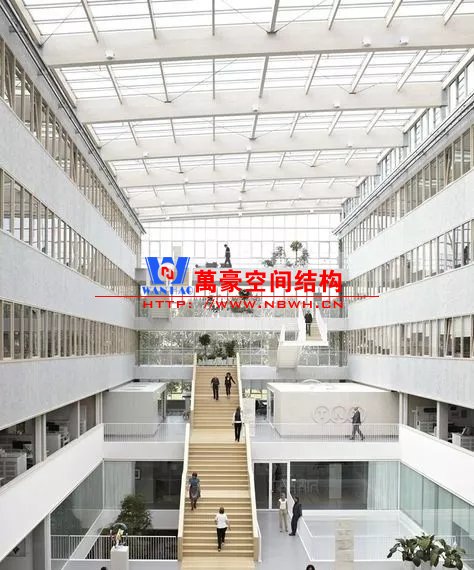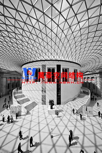 這個經典的改造項目把輕與重巧妙組合。鋼結構網殼內側支承于圓形閱覽室,外側支承于方形博物館建筑的內墻,通過找形分析得到一個拱起的規則形態。