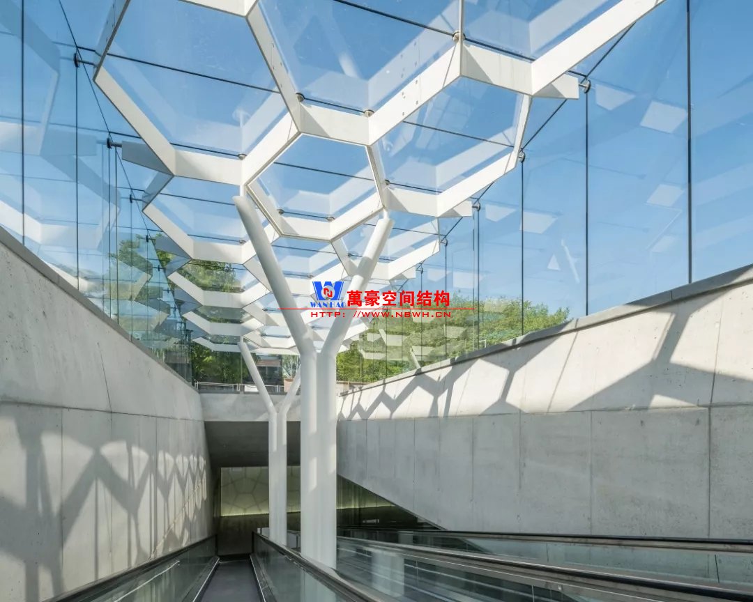 傘狀穹頂結構充分發揮了網殼的形抗優勢,最小桿件截面僅100x100mm,營造出建筑師非常期待的精致輕盈效果。