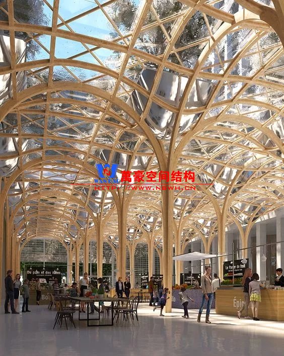 以上各種天幕結構均是支承在周邊建筑或樹形上的。除此以外,還有一種以天幕網格獨立或相對獨立支承的結構,其建筑形態往往呈現“喇叭形”。