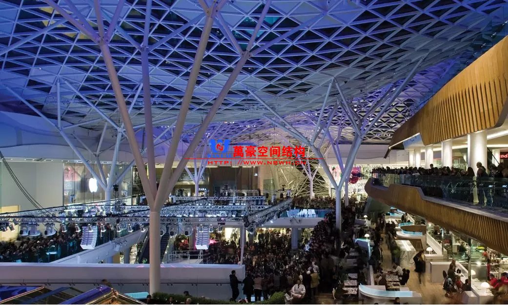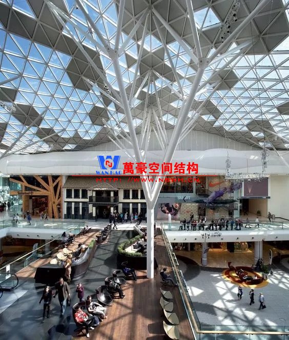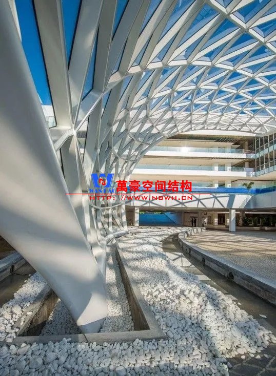 有的天幕雖然設計為曲面,但其曲面形狀的力學性能差,結構受力仍然以抗彎為主。這類曲面天幕結構與樹形柱相結合,才能以較細小的結構構件完成。