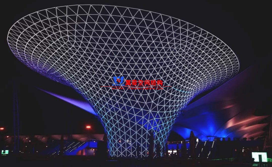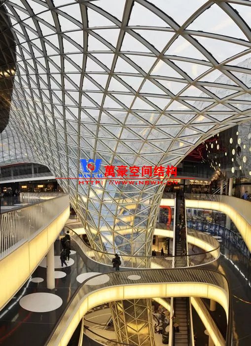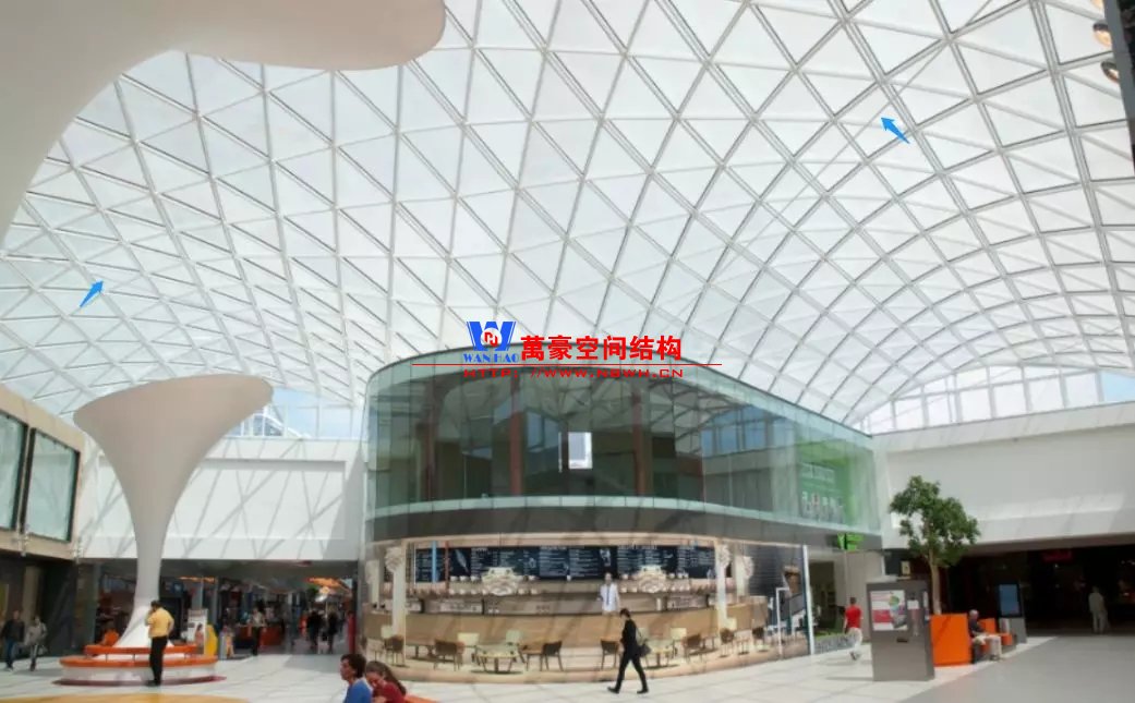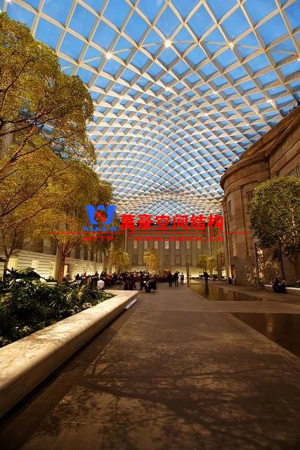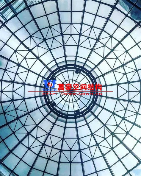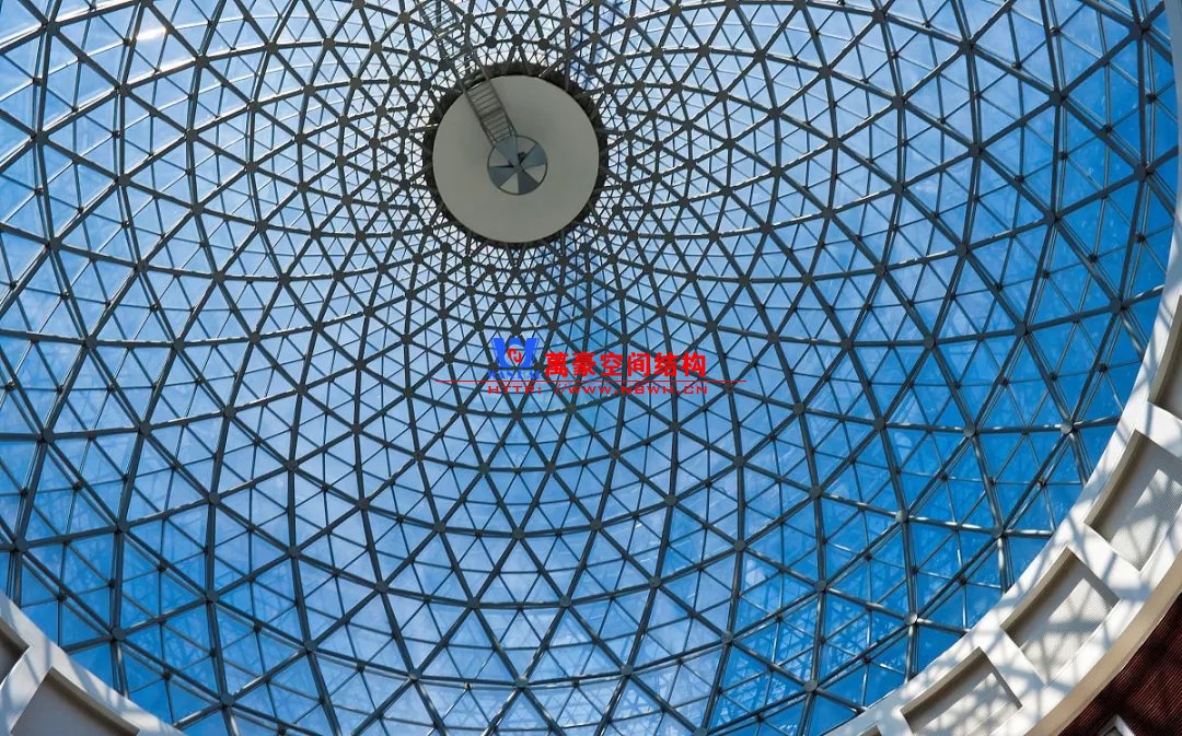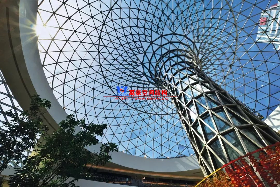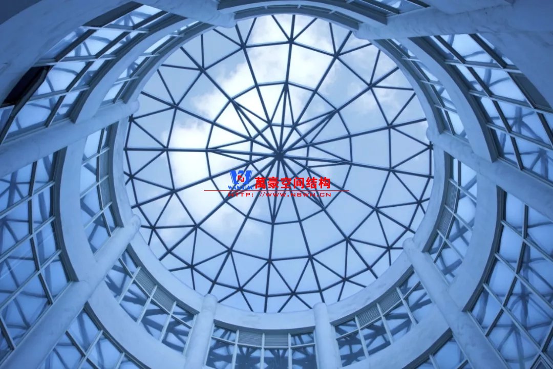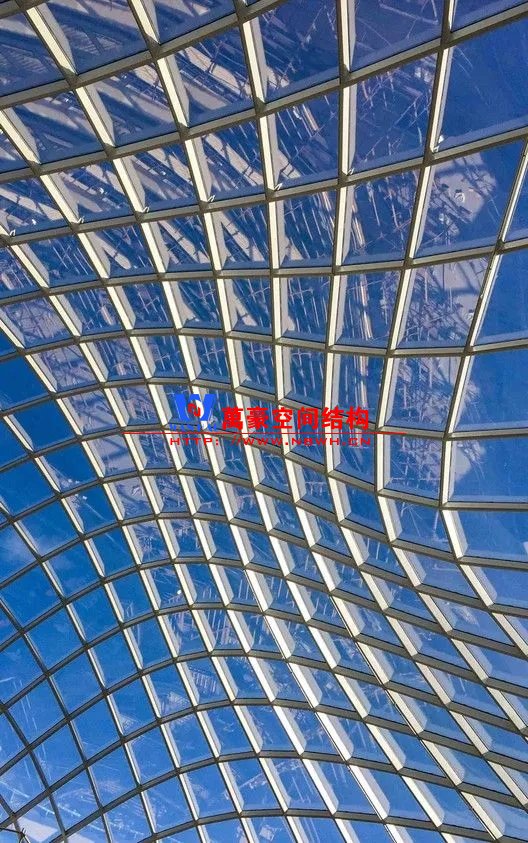規則曲面的天幕一般采用鋼結構網殼形式,利用網殼曲面的形抗原理,結構以軸向受力為主、效率高,以較小的截面尺寸即可實現很大跨度。這一類網殼曲面多為圓柱面、球面。