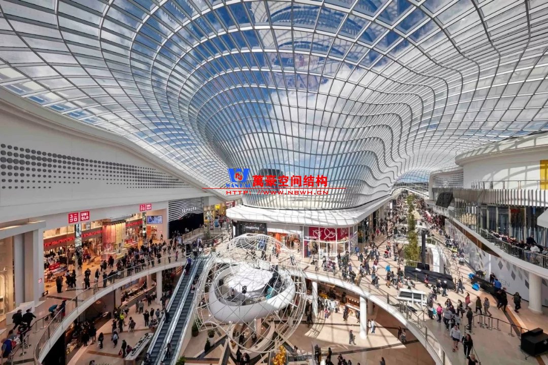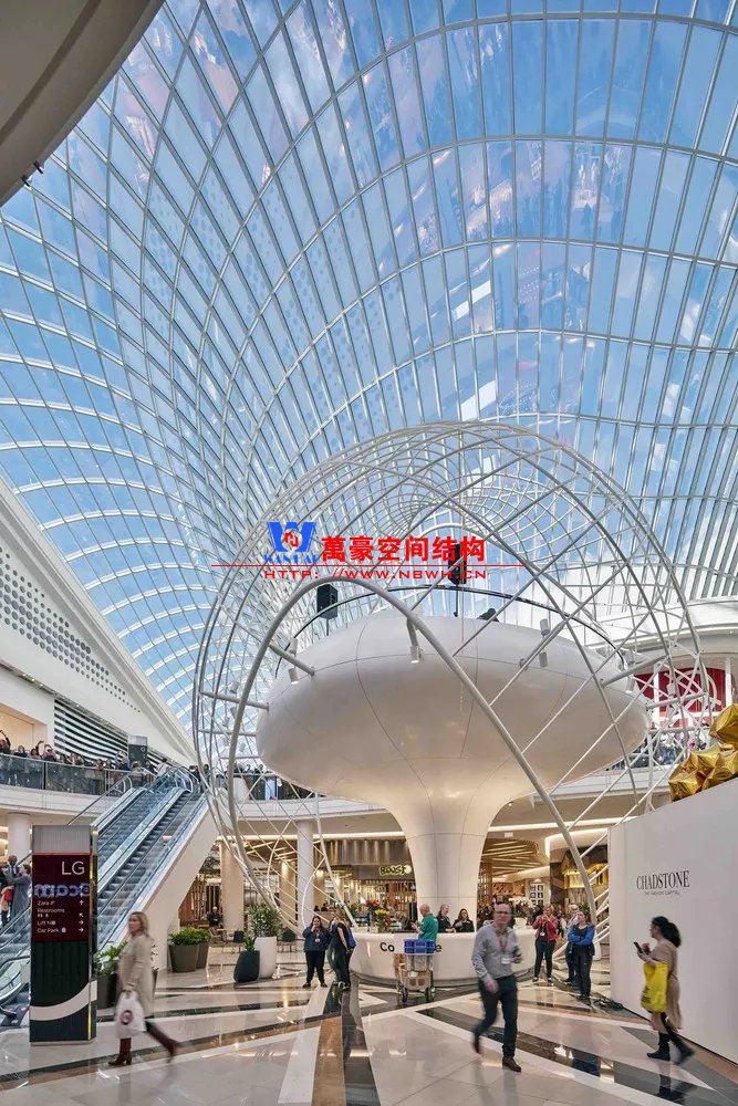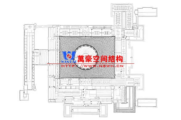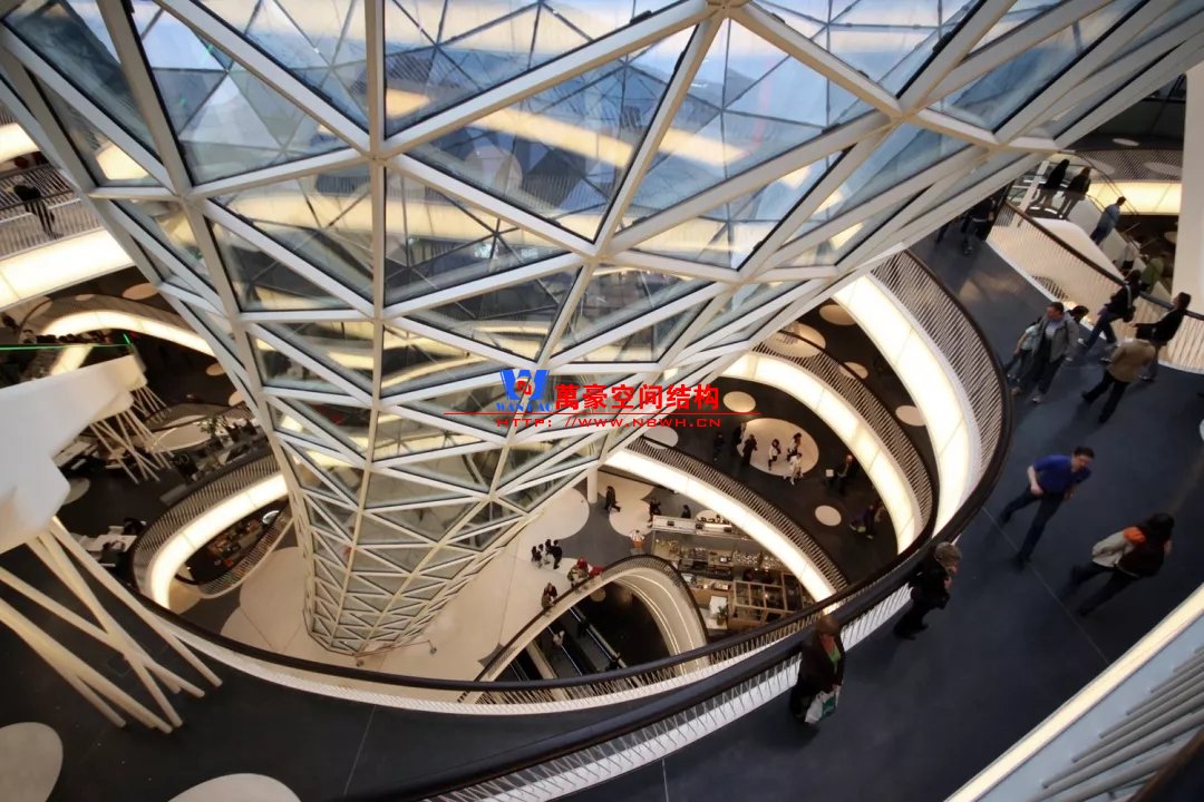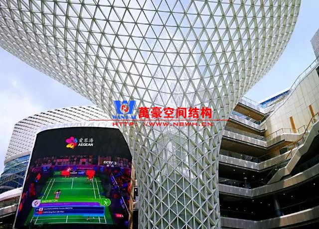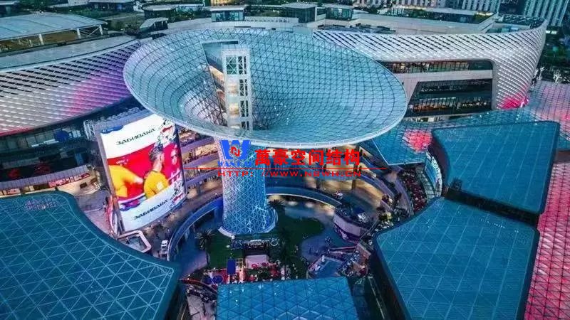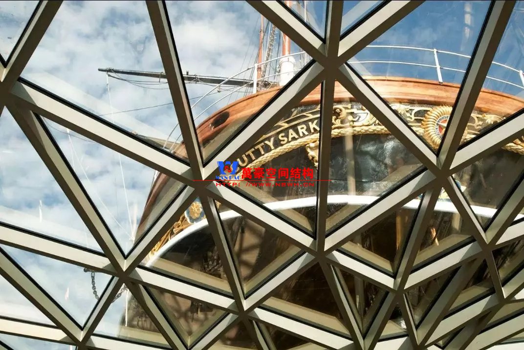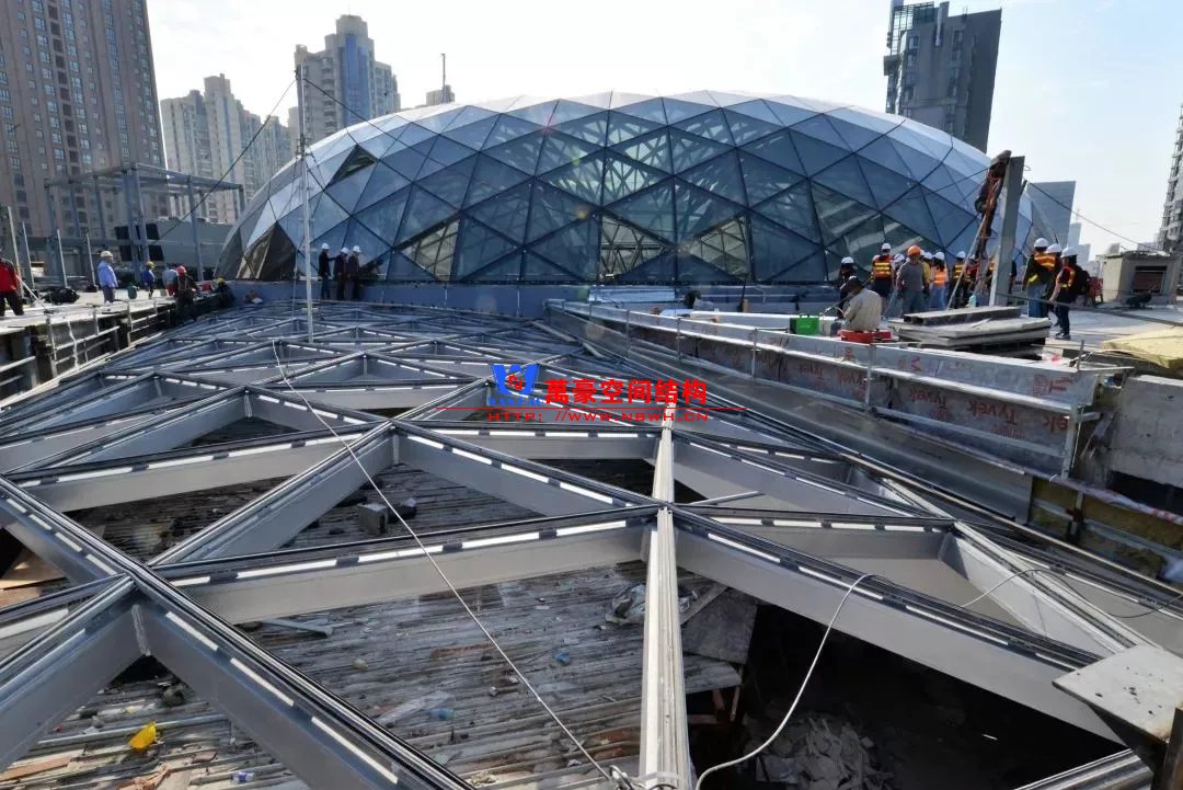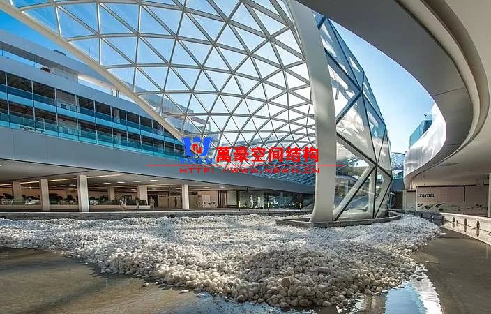 規則曲面的天幕一般采用鋼結構網殼形式,利用網殼曲面的形抗原理,結構以軸向受力為主、效率高,以較小的截面尺寸即可實現很大跨度。這一類網殼曲面多為圓柱面、球面。