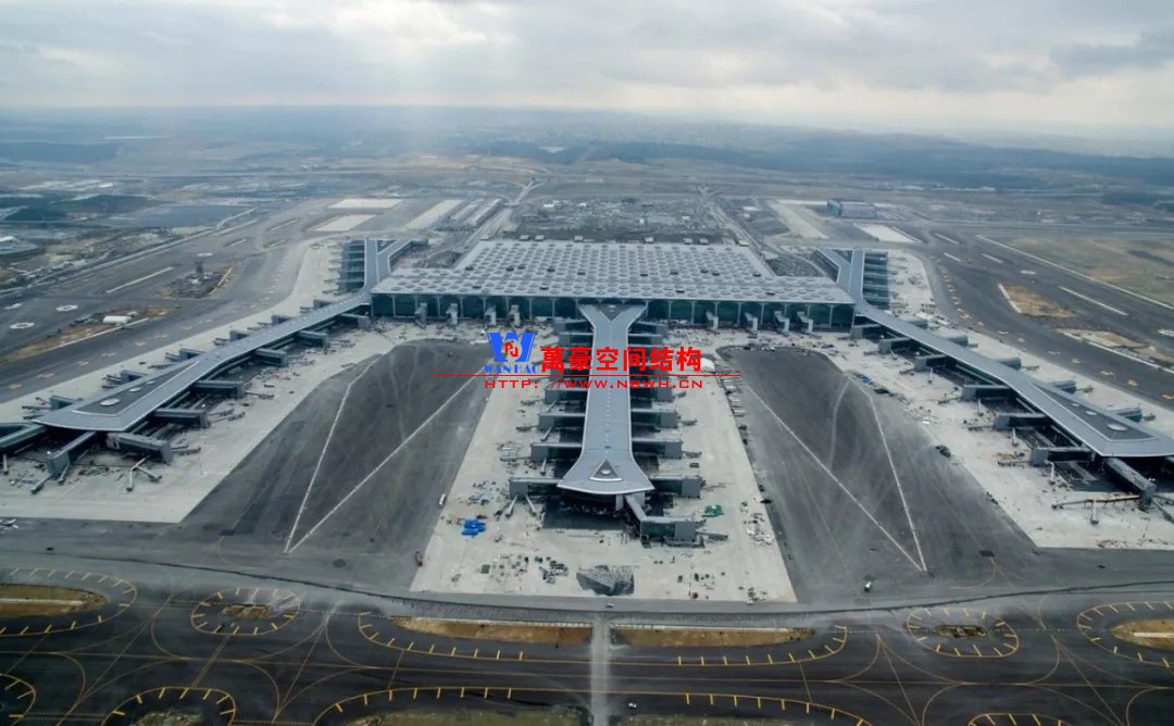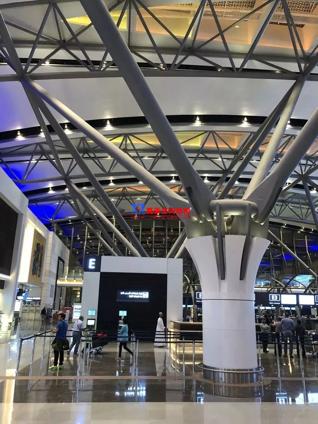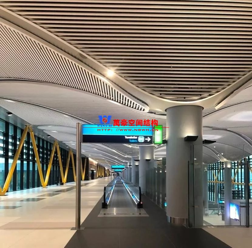 如果室內建筑吊頂效果比較特殊,那么空間網格結構更能發揮其適應性強的特點,比如伊斯坦布爾新機場。室內是單元式的吊頂曲面比較復雜,設計時采用空間交叉桁架結構貼合表皮布置桁架弦桿,同時在桁架之間搭設次桁架和次梁形成復雜的吊頂面。通過化整為零的方法,結構建造難度大大降低,最終建筑效果也很好。同時中部混凝土柱承擔豎向力,立面布置斜撐增加結構的抗側剛度,兩類柱子在尺度和顏色上形成反差,在視覺上就能感受到結構的邏輯。
