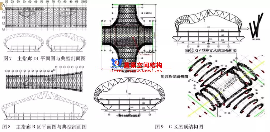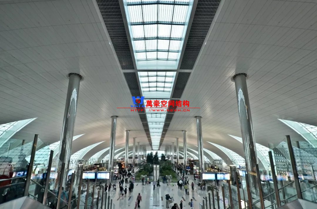 無獨有偶迪拜機場也是采用相似的外形,但是由于剖面并不是一個完整的拱形,因此構件內彎矩作用會比較明顯,因此在室內布置了兩根柱子。立面幕墻則采用索桁架半剛性幕墻立面更加通透。與雙流機場不同,結構構件是吊頂外包的,因此外包區域采用了效率更高的主次梁體系。