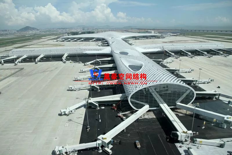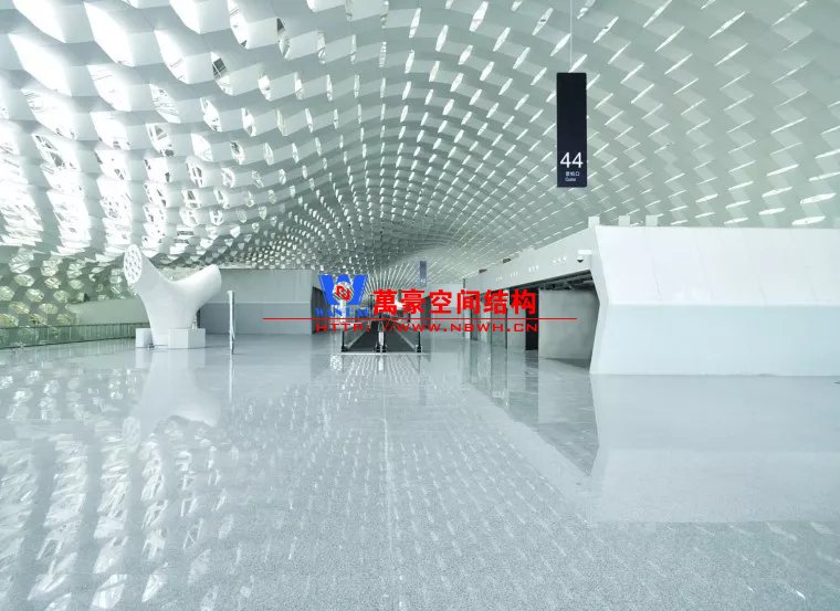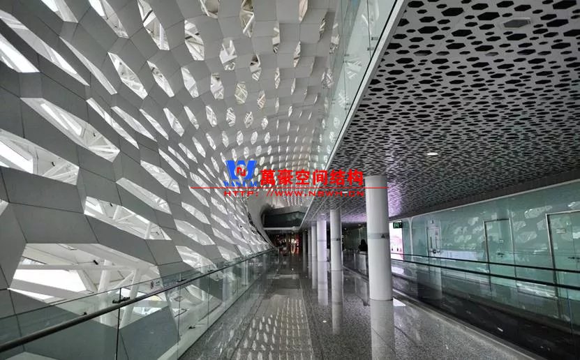 當然也可以用萬能的桁架和網架去擬合筒形的曲面,但建筑的不同處理方法,會讓最終效果呈現出完全不同的感覺。如深圳寶安機場采用桁架+網架的結構體系貼合建筑的上下表皮,最終建筑做吊頂外包,建筑吊頂采用鏤空的形式表達出建筑紋理,但在縫隙中可以看到結構構件。