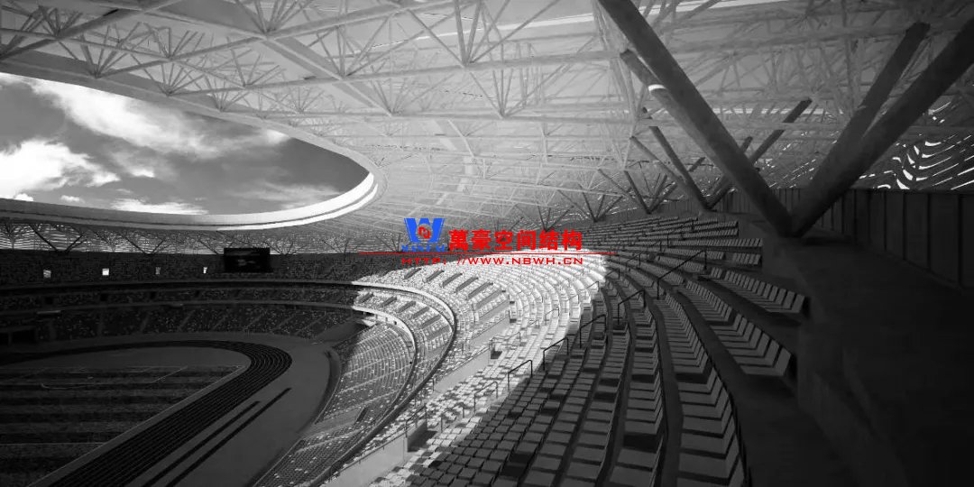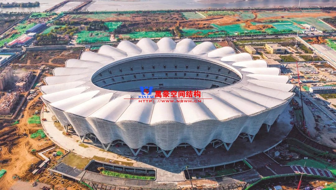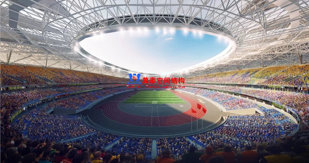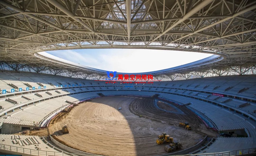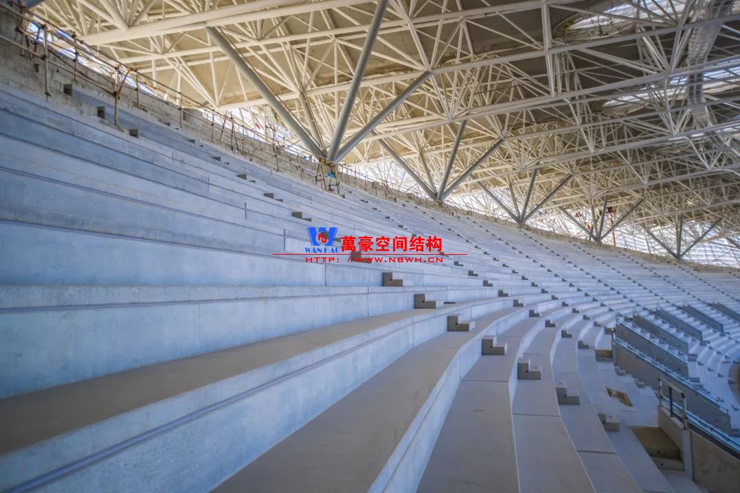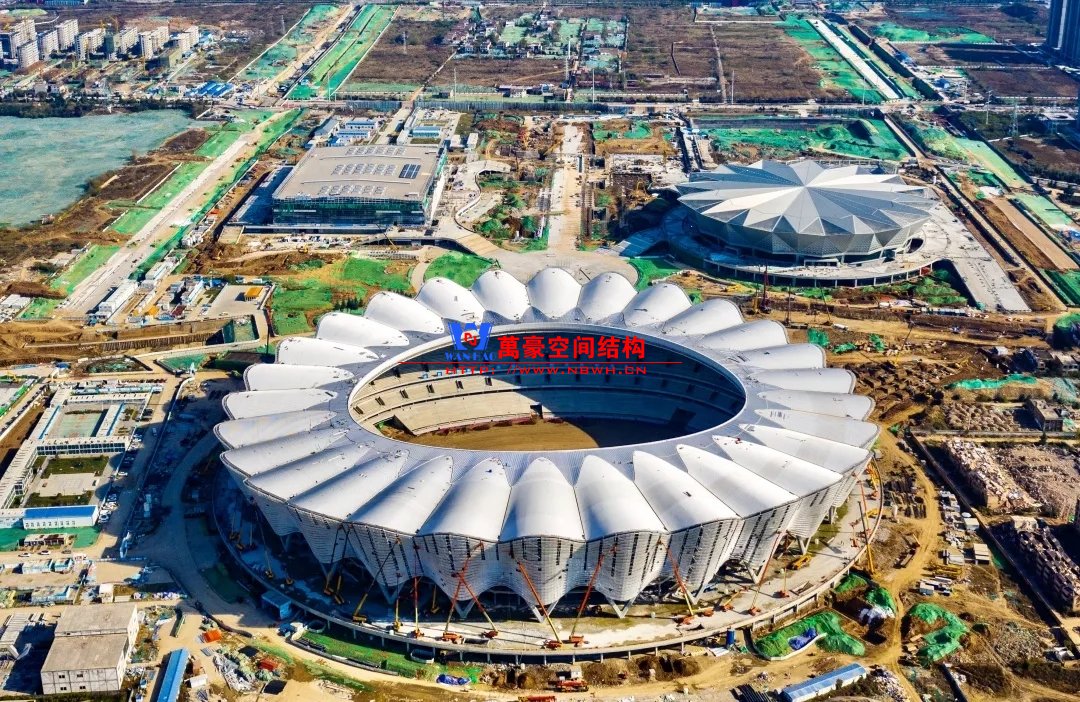 體育場主體建筑為南北長332m、東西寬316m的橢圓形,鋼結(jié)構(gòu)罩棚最高處高58.3m,最低處高42.6m;中間開口南北長200m、東西寬153m。主體鋼結(jié)構(gòu)采用空間懸挑鋼桁架結(jié)構(gòu),由28個V形柱支撐72片鋼結(jié)構(gòu)管桁架,整體東西高,南北低,呈馬鞍形,體育場看臺為框架-剪力墻體系。屋頂圍護結(jié)構(gòu)為鋁鎂錳直立鎖邊金屬屋面,罩棚立面采用銀白色穿孔鋁板幕墻系統(tǒng),通過有韻律的變化,表達了絲綢飄舞的動感,輕盈通透的罩棚在夜晚能夠透出賽場內(nèi)熱烈的賽事氣氛,宛如皓月長空下綻放的盛世之花。碗型看臺分為上、中、下三層座席,并在中上層看臺之間設(shè)置包廂層(包括66個大小包廂)及其座席區(qū),觀眾分別由各層看臺對應(yīng)的通道進入。