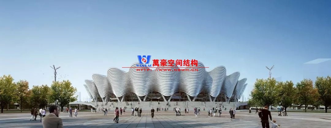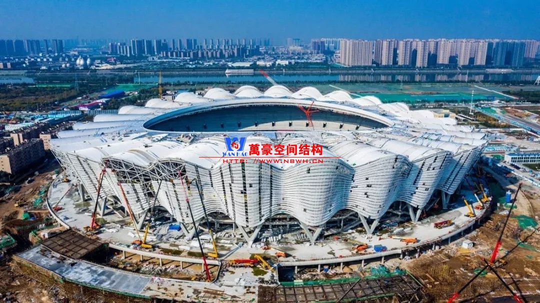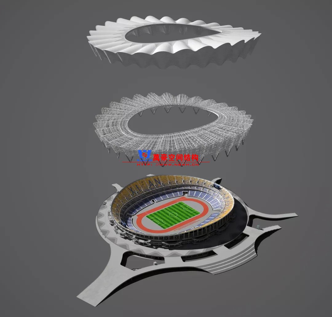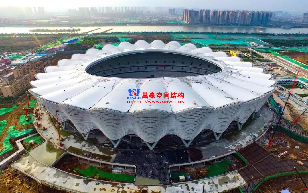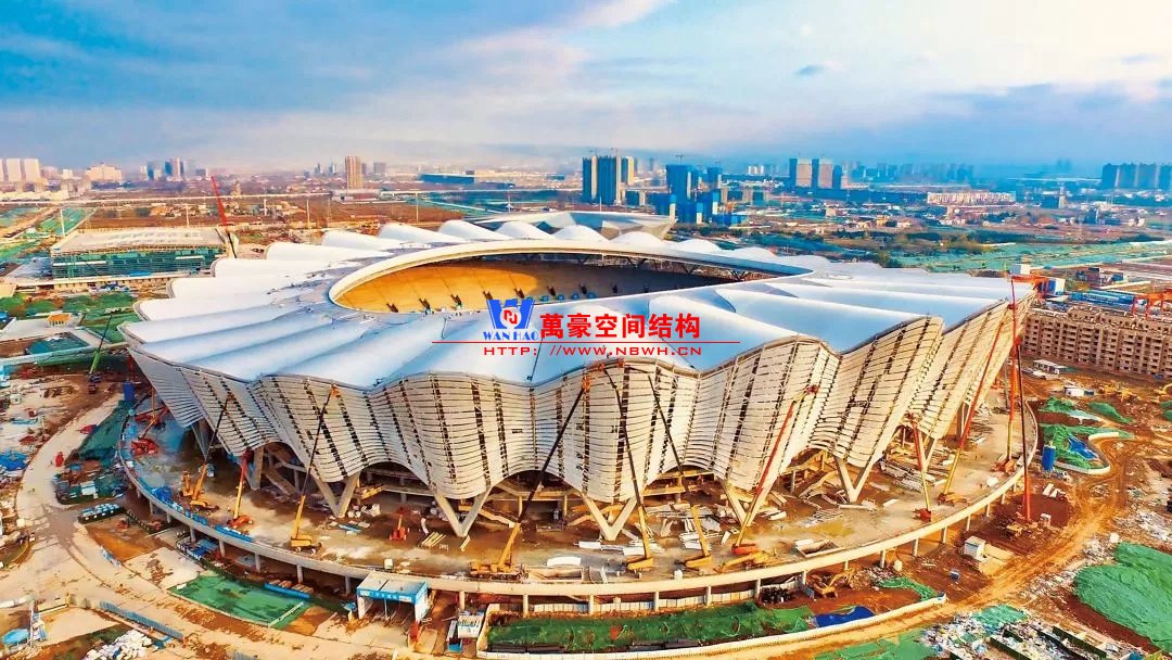 體育場主體建筑為南北長332m、東西寬316m的橢圓形,鋼結(jié)構(gòu)罩棚最高處高58.3m,最低處高42.6m;中間開口南北長200m、東西寬153m。主體鋼結(jié)構(gòu)采用空間懸挑鋼桁架結(jié)構(gòu),由28個V形柱支撐72片鋼結(jié)構(gòu)管桁架,整體東西高,南北低,呈馬鞍形,體育場看臺為框架-剪力墻體系。屋頂圍護結(jié)構(gòu)為鋁鎂錳直立鎖邊金屬屋面,罩棚立面采用銀白色穿孔鋁板幕墻系統(tǒng),通過有韻律的變化,表達了絲綢飄舞的動感,輕盈通透的罩棚在夜晚能夠透出賽場內(nèi)熱烈的賽事氣氛,宛如皓月長空下綻放的盛世之花。碗型看臺分為上、中、下三層座席,并在中上層看臺之間設(shè)置包廂層(包括66個大小包廂)及其座席區(qū),觀眾分別由各層看臺對應(yīng)的通道進入。