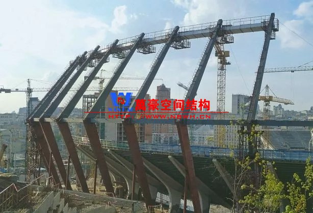 基輔國家奧林匹克體育場保留了大部分建于1968年的的原混凝土看臺(tái)結(jié)構(gòu),屋蓋結(jié)構(gòu)則通過設(shè)置在看臺(tái)結(jié)構(gòu)外圍的鋼結(jié)構(gòu)立柱進(jìn)行支撐,這樣避免了將屋蓋結(jié)構(gòu)的自重和承受的外力直接作用到原混凝土結(jié)構(gòu)及其下部基礎(chǔ)上去。