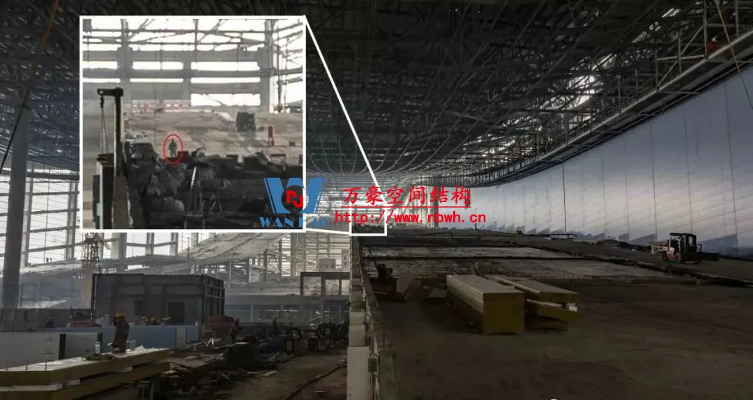 水雪綜合體高中低三區(qū)屋蓋,需要采用不同的安裝方式。低區(qū)屋蓋直接在地面拼裝,然后再吊裝就位;中區(qū)屋蓋需要采用原位拼裝+整體累計提升的方式;高區(qū)屋蓋則采用累積滑移+局部提升的方式,沿滑雪道布置兩條大滑梯,地面拼裝后再將鋼材部件順著滑梯滑上去,到達(dá)固定位置時對接安裝好完成。