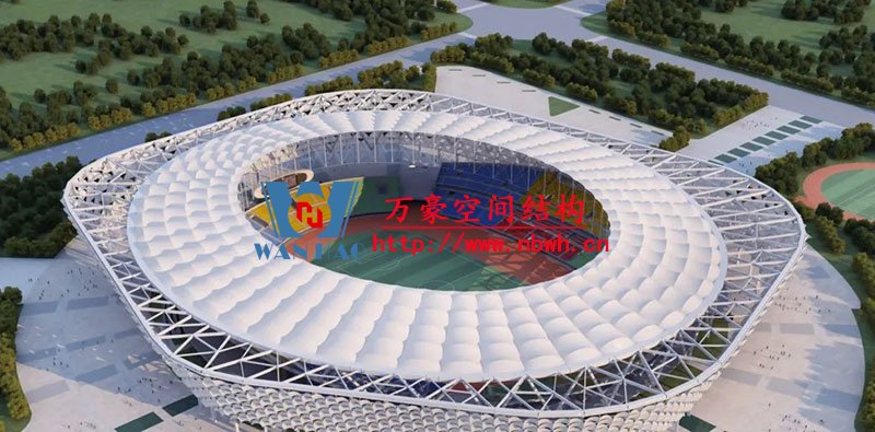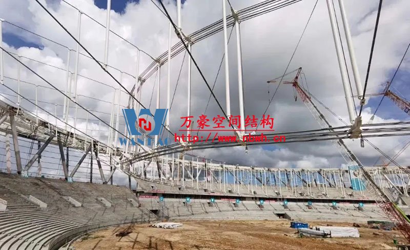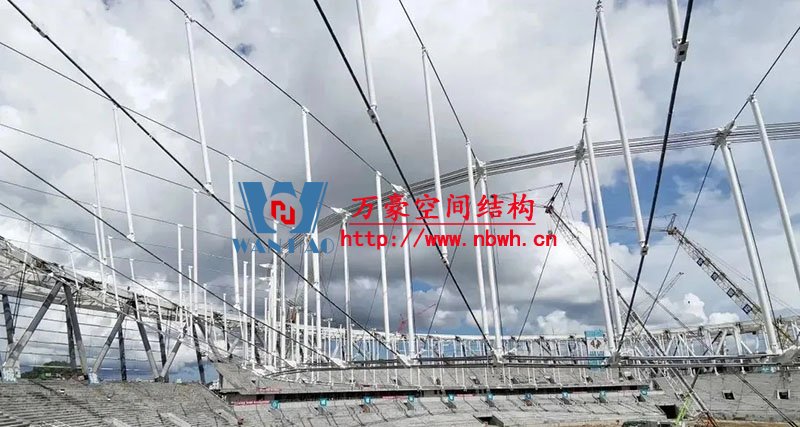 三亞體育場總建筑面積8.8萬余平米,體育場屋蓋為輪輻式索桁架結構,平面投影短軸224米、長軸261.8米,中心開口短軸134米,長軸171.8米。為提升結構抗風能力,屋蓋結構布置內環交叉索;為降低內環交叉索對鎖夾造成的不平衡力,該項目創新應用了強模比遠高于普通鋼索的CFRP平行板索,以新材料、新構件完美解決了結構問題。
