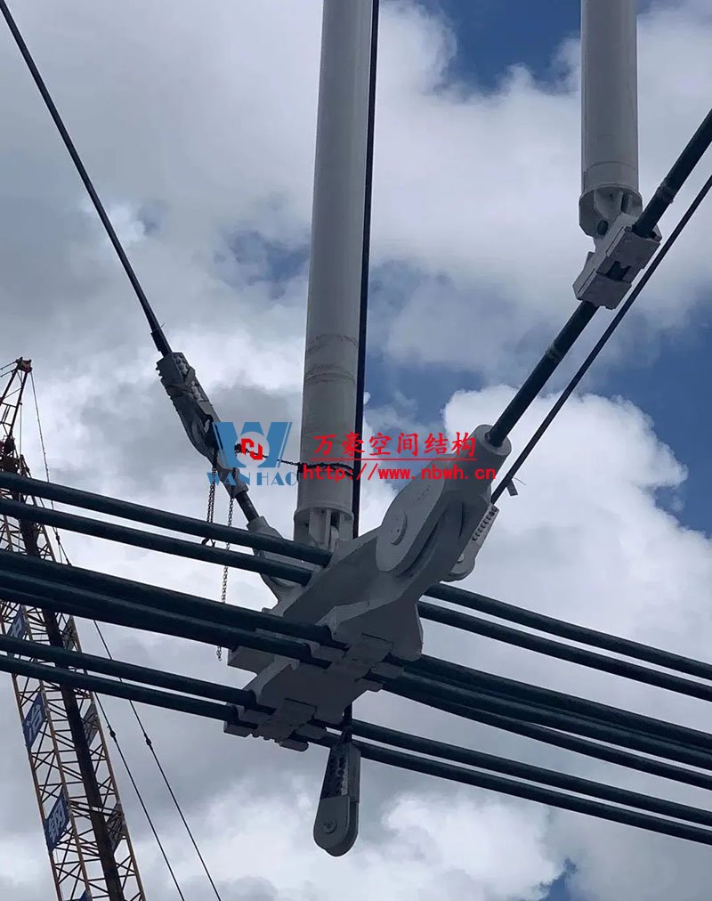 施工現場擺放了索結構所用的材料樣品,供參加調研的人員詳細了解。這些樣品分別是國產高釩密閉索、鑄鋼焊接試件、索夾、碳纖維索樣品。據調研專家介紹,碳纖維索是全球首次在大跨度空間結構中應用,三亞市體育場項目應用的高釩密閉索最大直徑達到了120mm,是國內綜合性體育場建設中使用的最大直徑,G10MnMoV6-3+QT2鑄鋼索夾也是國內第一次運用到建筑當中。