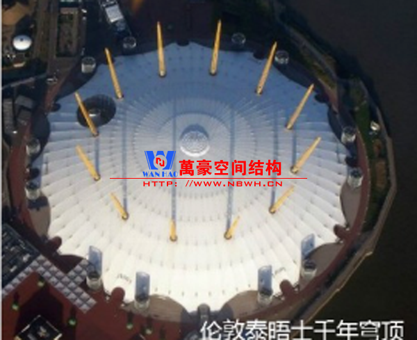 千年穹頂1999年底建成,其造型很奇特,它有12根穿出屋面高達(dá)100米的桅桿,屋蓋采用圓球形的張拉膜結(jié)構(gòu)。膜面支承在72根幅射狀的鋼索上,遠(yuǎn)遠(yuǎn)望去像一個(gè)白色的大帳篷。