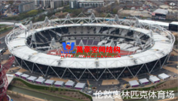倫敦奧林匹克體育場在奧運(yùn)和殘奧期間是8萬座位的體育場,賽后轉(zhuǎn)換成一個(gè)2.5萬座位的體育場。人字形柱支承外壓縮環(huán)桁架,內(nèi)張力環(huán)采用索,其間輻射布置雙層徑向索形成索網(wǎng),上覆112片PVC膜材張緊形成罩蓬,是典型的索系支承式膜結(jié)構(gòu)。