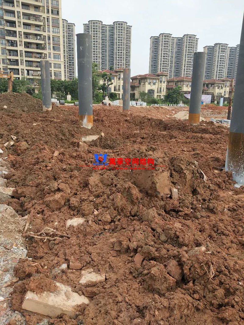 廣場鋼拉膜項目由六個龍船花造形景觀組成,每個龍船花景觀造形立柱的高度不得低于3.80米,花瓣造形最低高度 7.54米,花瓣造形最高高度9.608米,膜結構屋面材質為 PTFE網格基布雙面貼透明ETFE建筑膜材。目前立柱已安裝完成,準備開始安裝其它構件。