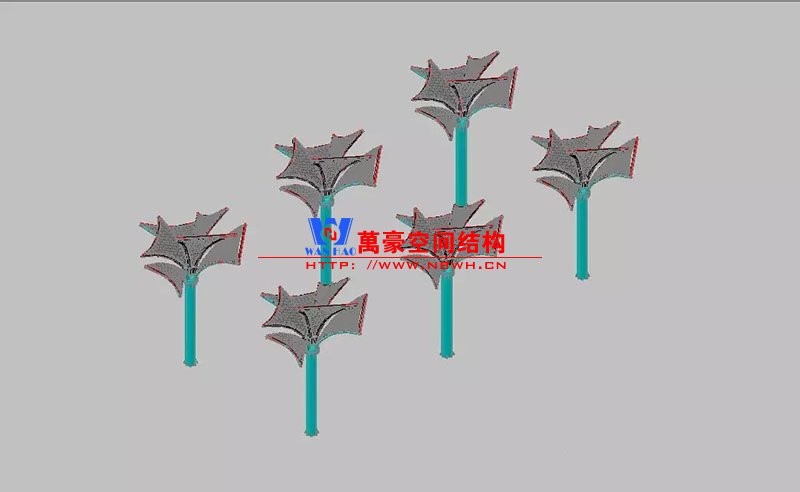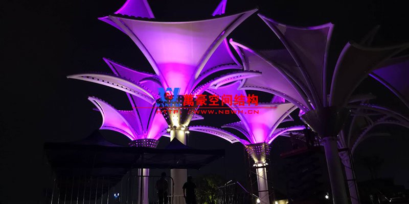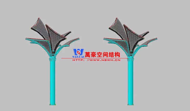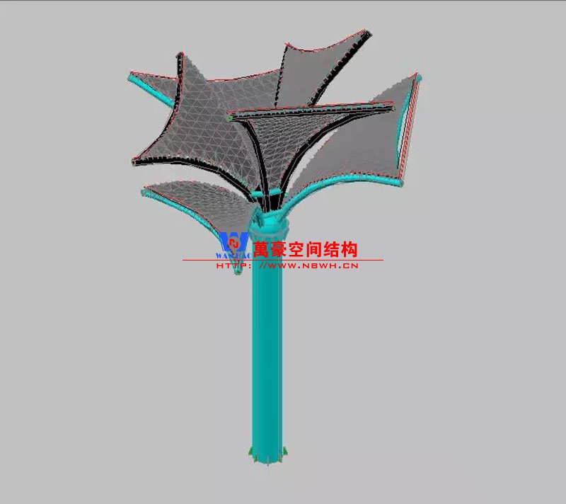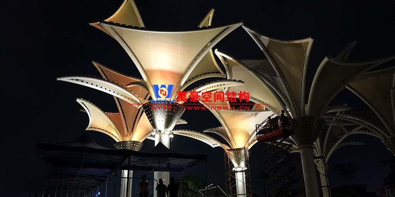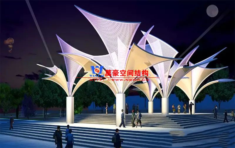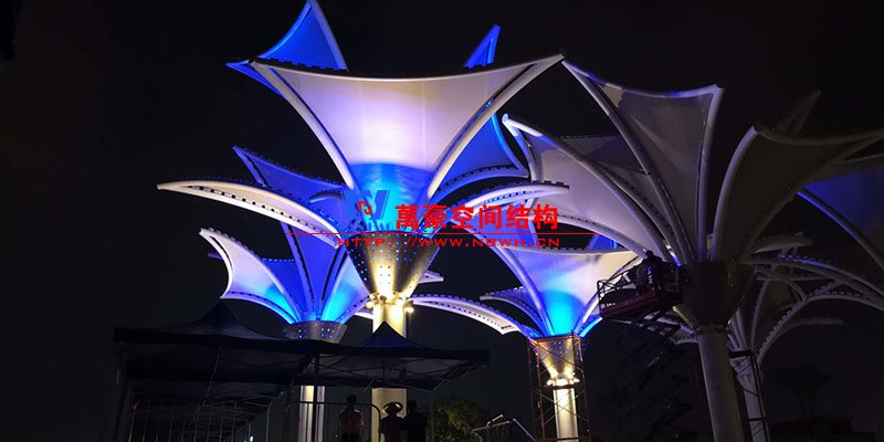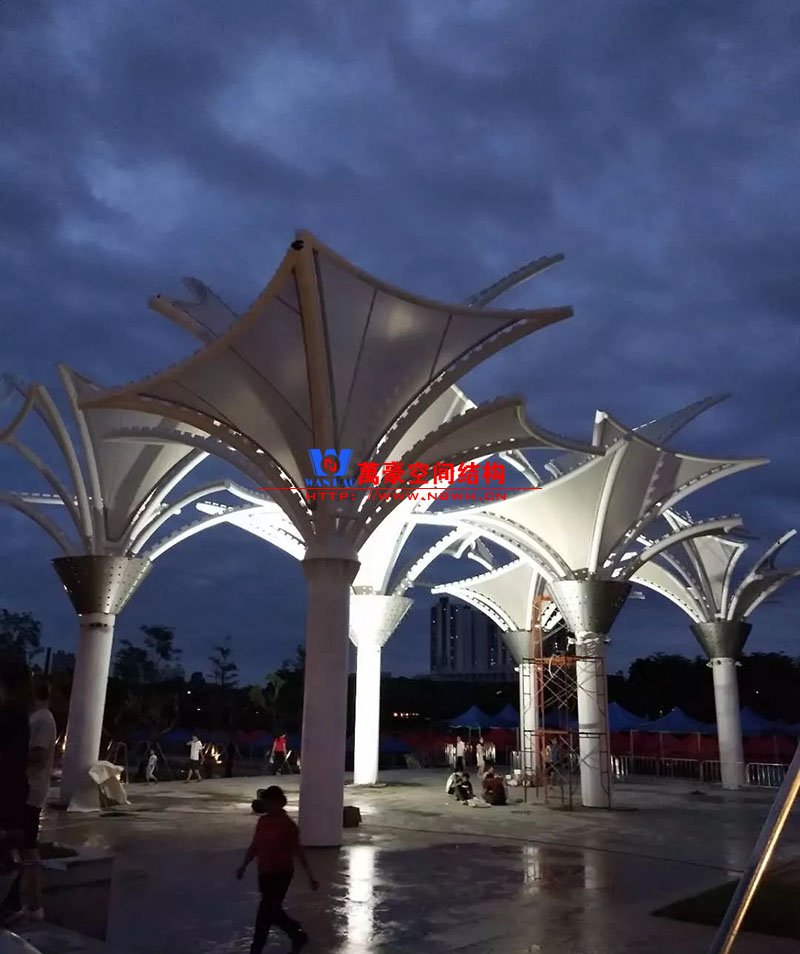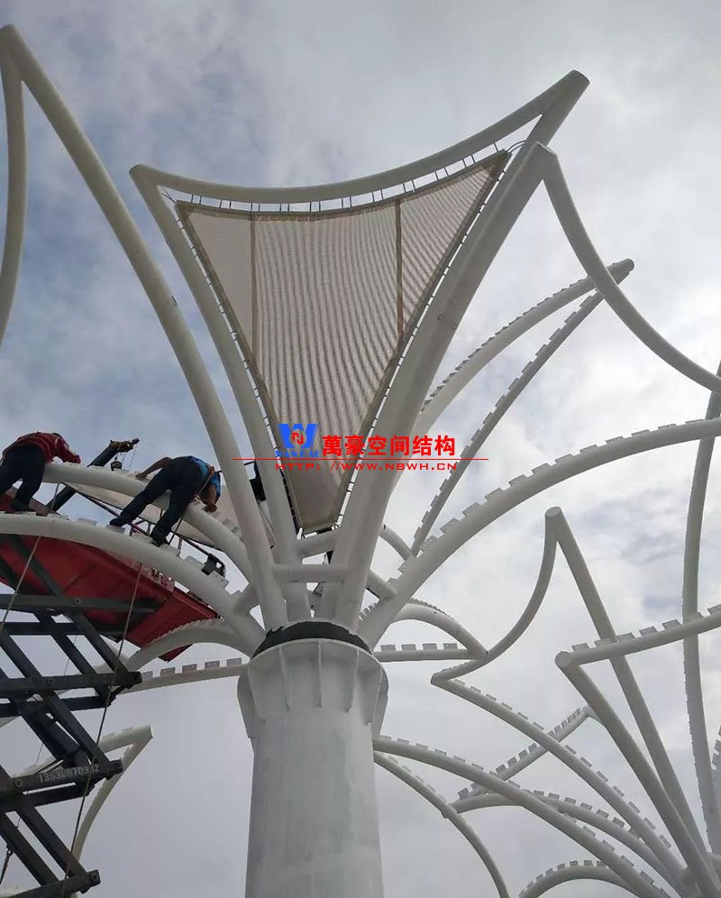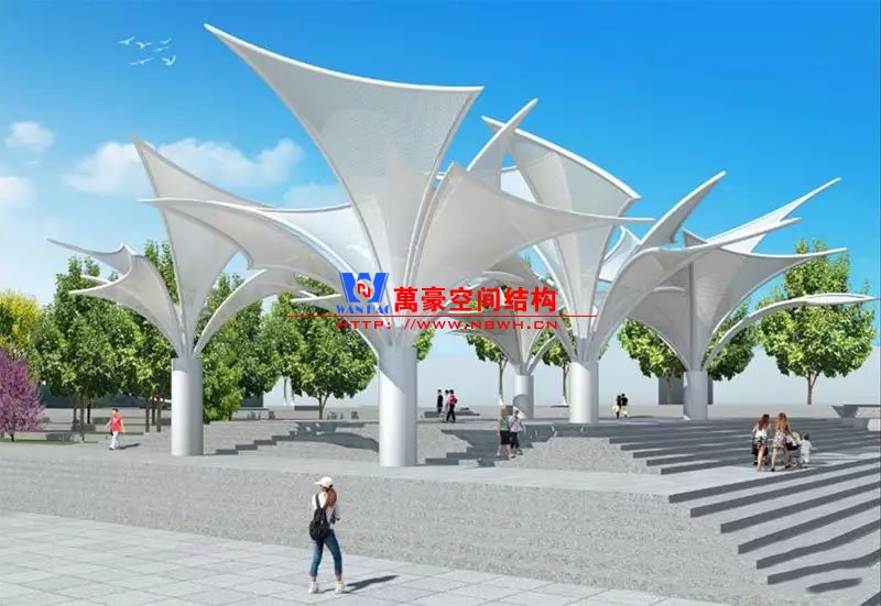 其中主席臺(tái)龍舟拉膜項(xiàng)目高度為7.25米,膜結(jié)構(gòu)屋面材質(zhì)為PTFE膜材。廣場(chǎng)鋼拉膜項(xiàng)目由六個(gè)龍船花造形景觀組成,每個(gè)龍船花景觀造形立柱的高度不得低于3.80米,花瓣造形最低高度 7.54米,花瓣造形最高高度9.608米,膜結(jié)構(gòu)屋面材質(zhì)為 PTFE網(wǎng)格基布雙面貼透明ETFE建筑膜。