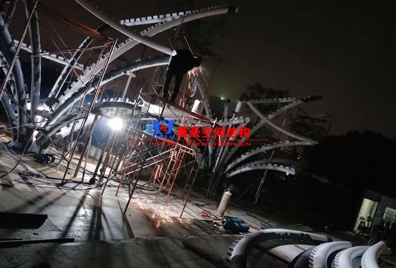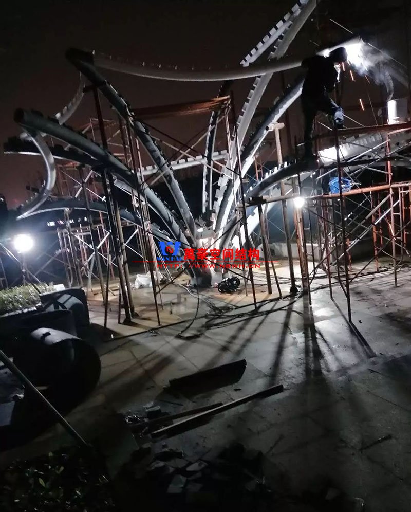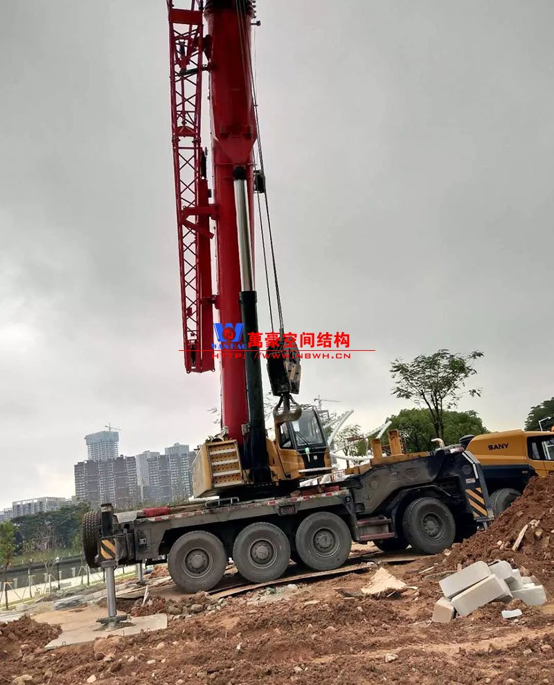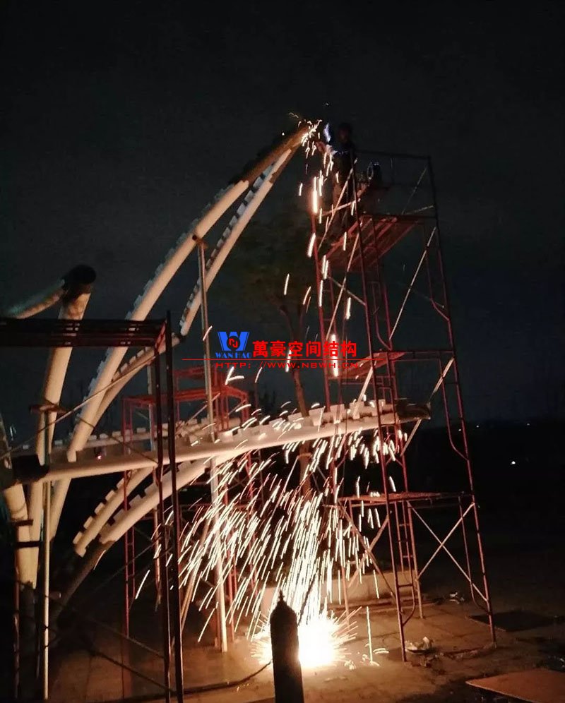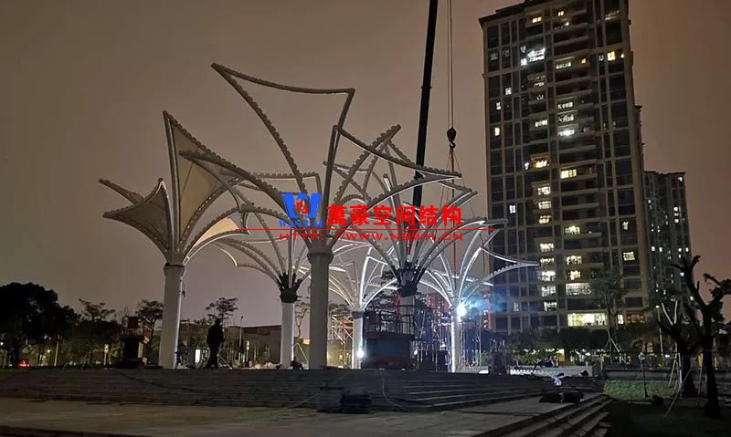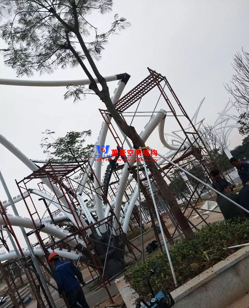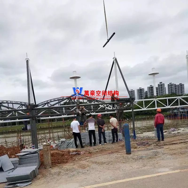 鋼構(gòu)安裝初步完成,效果初現(xiàn),膜結(jié)構(gòu)開(kāi)始安裝。
