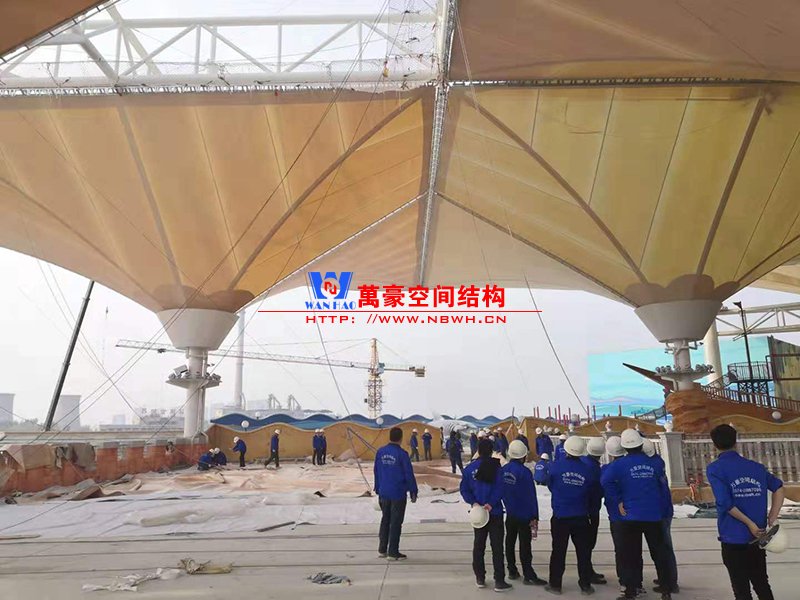 ? 聊城歡樂小鎮七彩云朵項目膜結構工程倒傘型最大單體8千平米,落地立柱最高60米,直徑1.2米,最大懸挑36米,項目創造了國內文旅商業類屋頂倒傘類之最。燈光已經進入安裝調試階段,五彩繽紛的造型在夜幕中綻放更有獨占鰲頭的磅礴氣勢。領導肯定的說該項目在當地10年內再無其他項目超越,自信和自豪并存,膜結構項目得到業主總指揮及相關管理部門的高度評價和認可,極大的鼓舞了現場施工氣氛與斗志,對現場要求再接再厲一氣呵成,爭做經典之作。