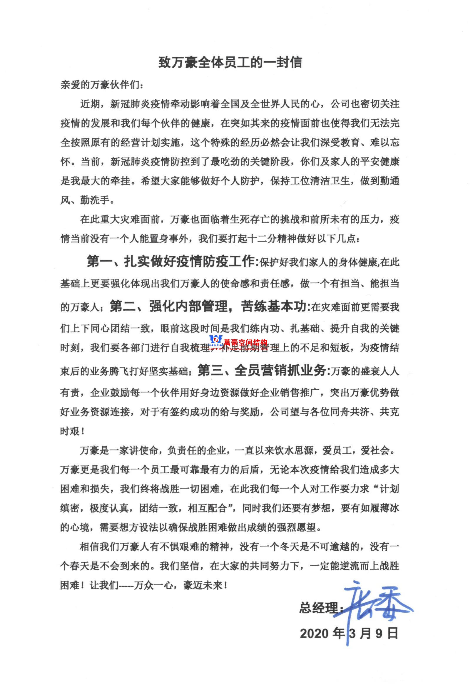 疫情當(dāng)前感謝大家返崗復(fù)工,在此疫情中我們深刻體會(huì)到了前所未有的壓力和困難,目前各行各業(yè)面臨著破產(chǎn)關(guān)門的風(fēng)險(xiǎn),我們同樣面臨著各方面的挑戰(zhàn)。在此存亡之際挑戰(zhàn)面前更需要我們上下同心,團(tuán)結(jié)一致共同面對(duì)目前的困難;萬豪是有使命感和責(zé)任感的企業(yè),在此危難時(shí)刻更能體現(xiàn)我們每個(gè)人的擔(dān)當(dāng)和格局,特此給萬豪全體員工書信一封,望大家能仔細(xì)查閱并落到實(shí)處,公司倡導(dǎo)全員營(yíng)銷,非市場(chǎng)部門員工如相互有業(yè)務(wù)連接、推薦、介紹給公司,統(tǒng)一報(bào)備總經(jīng)辦蔡總處登記備案,簽約成功公司將給與獎(jiǎng)勵(lì)。