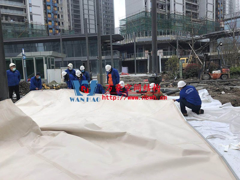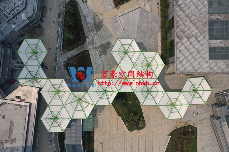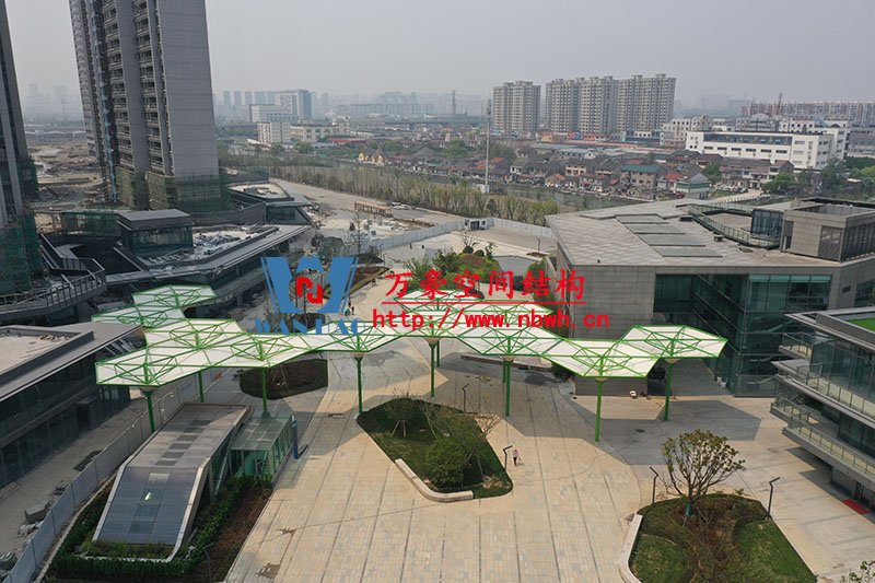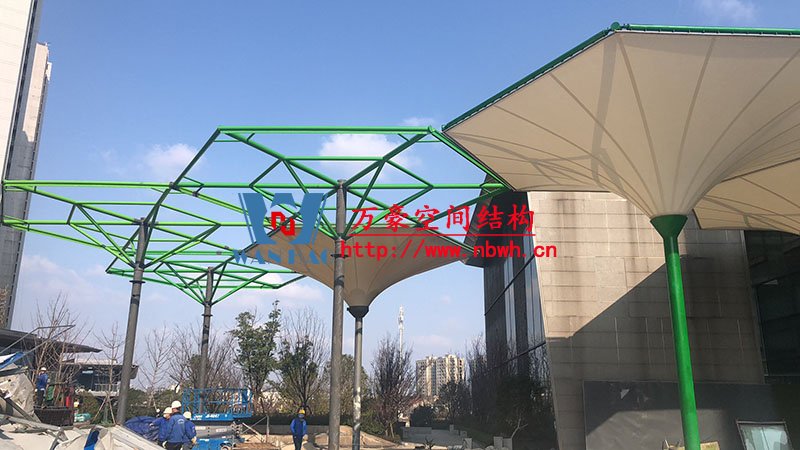 五鄉地鐵站傘狀PTFE膜結構項目位于浙江省寧波市楊柳郡,項目由19座倒傘膜結構組成,倒傘寓意盛開的牽牛花。該項目膜材使用進口PTFE膜材,膜結構展開面積5000平米,用鋼量100噸,由寧波萬豪空間結構工程有限公司承建。