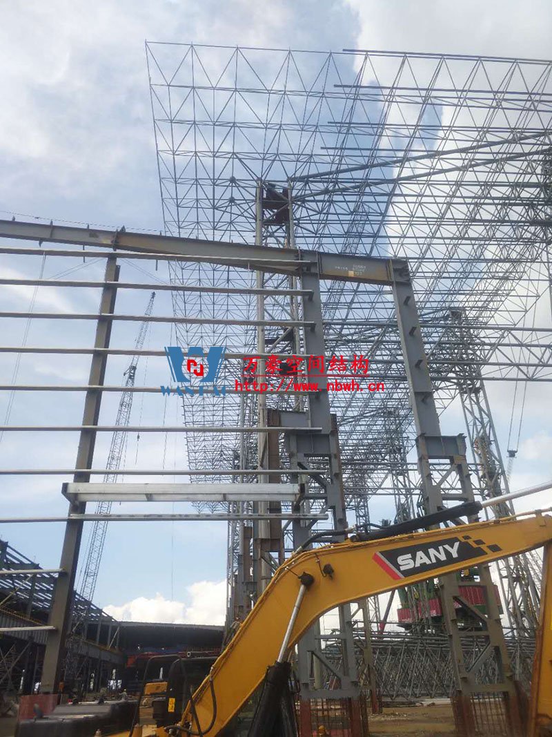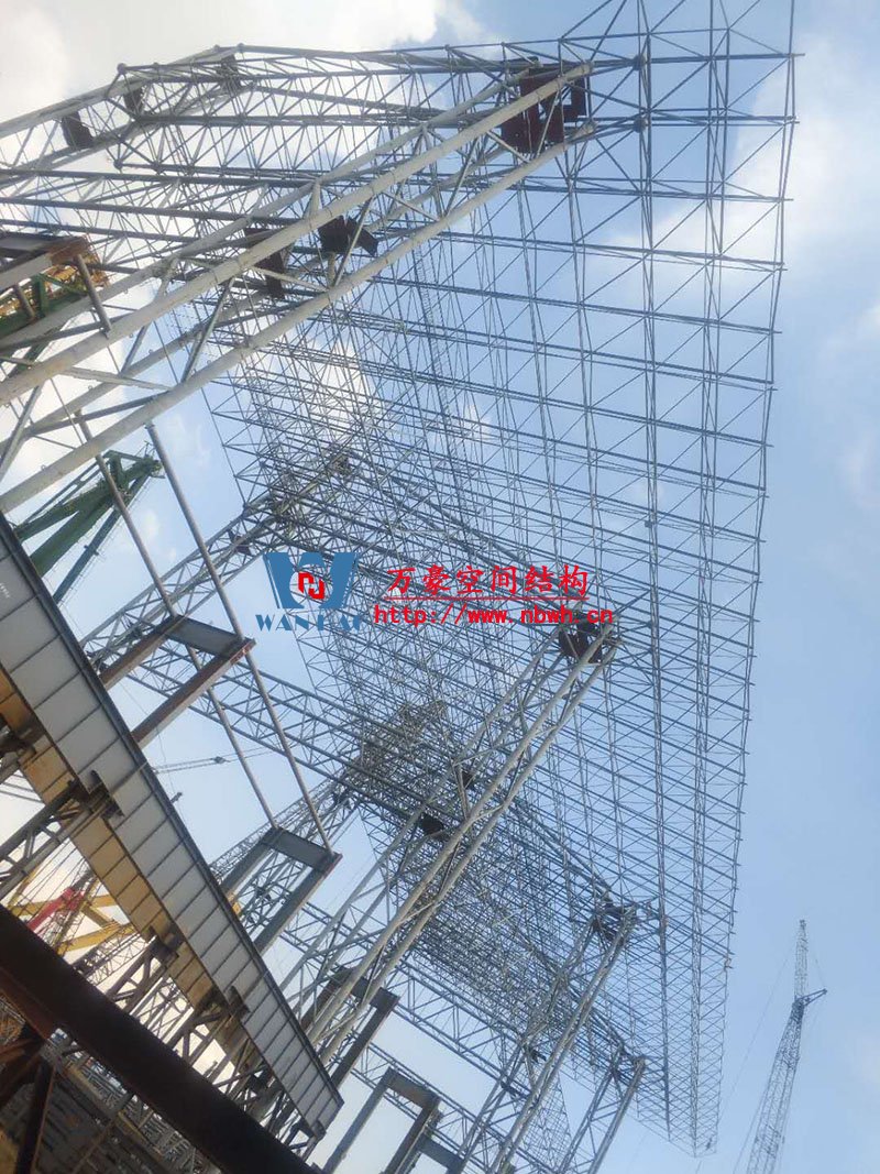 印尼全天候碼頭倉庫屋面膜結構工程高度55米,跨度160米,采用鋼結構地面整體拼裝,分區域整體起吊的安裝方式,鋼用量總共2000噸,膜結構展開面積30000平米,屋面膜結構工程由寧波萬豪空間結構有限公司承建。
