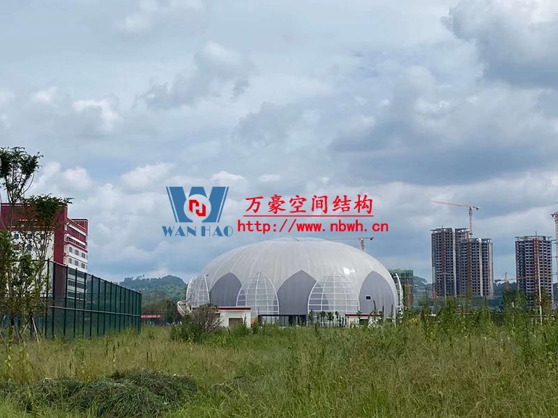 全封閉籃球館和多功能館結構部分采用了部分珩架與單層雙曲面網殼組合,屋面膜選用了不同顏色不同材質組合構成了含苞待放的花朵,項目落成后將為當地體育活動增添活力。