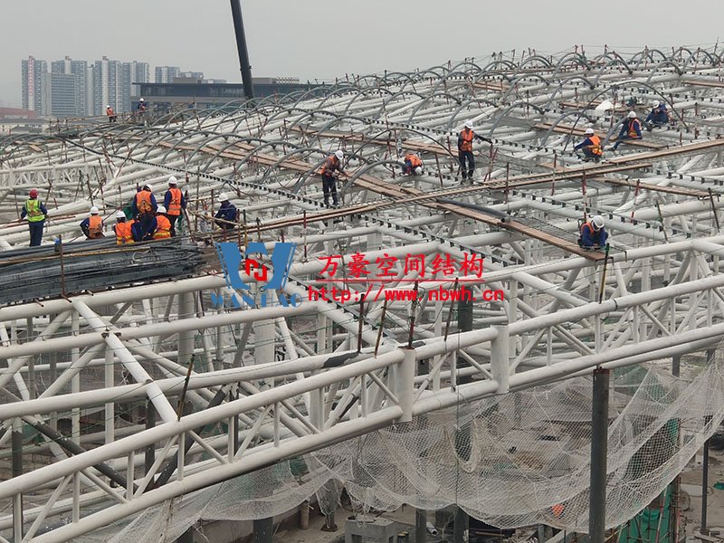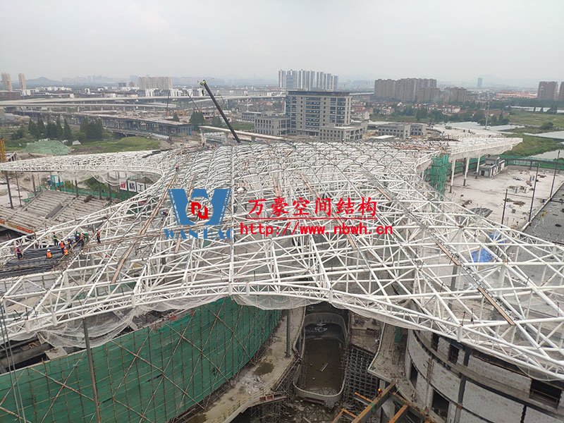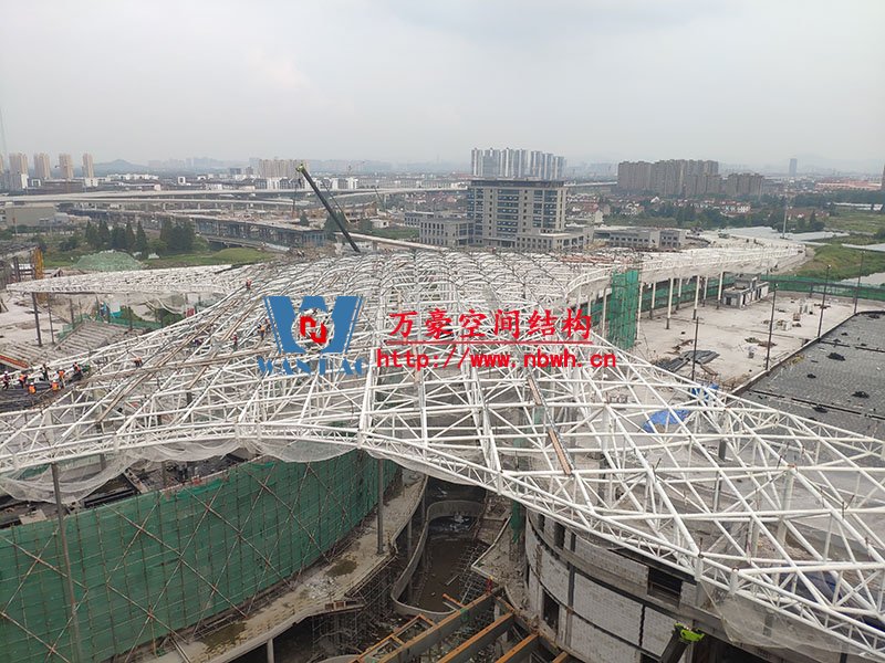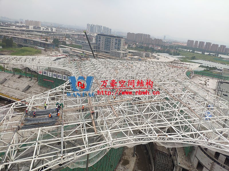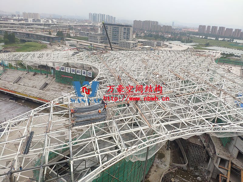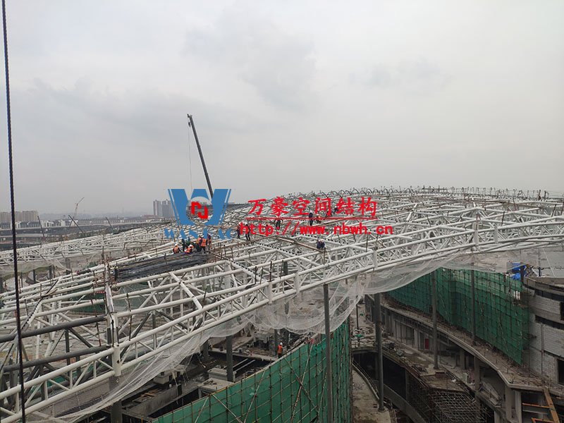 項目一共分六區,目前,一區鋼構件安裝完成,二區拉膜板安裝完成,拱桿完成50%。整體拱桿安裝完成45.6%,拉膜板安裝完成53.6%。