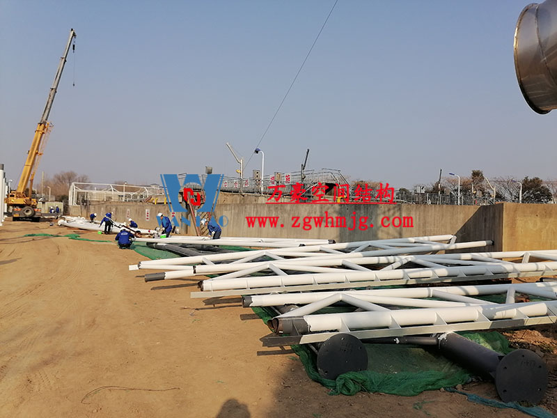 目前,進水口、粗格柵、細格柵、厭氧池兩個池子鋼結構都已完成 ,南區氧化溝的池子立柱已安裝完畢,準備進行下一步施工。