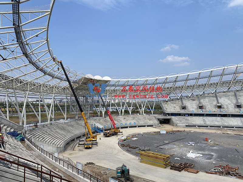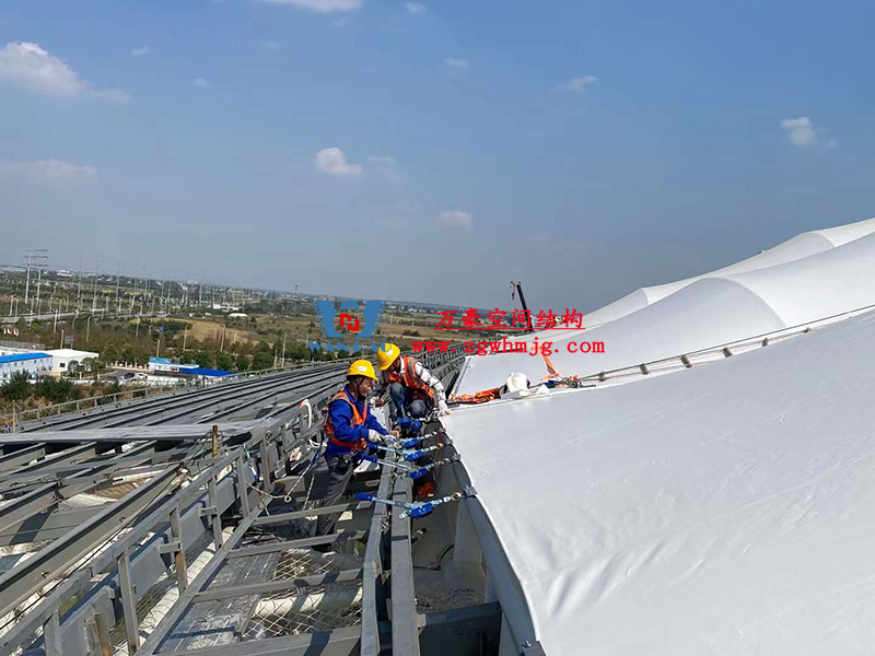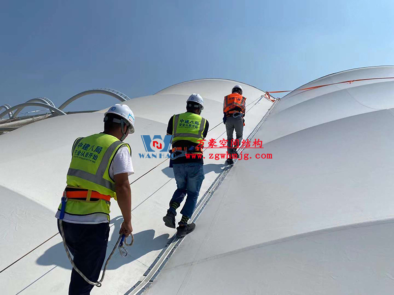 襄陽奧體中心PTFE膜結構屋面歷經幾個月的緊張工作,已經全面投入高峰期作業。在最高溫的天氣夾雜著汗水和最熱情的狀態譜寫著萬豪空間結構的故事,所謂藝高人膽大高瞻遠矚,現場的每一個人通過自己最樸實的勞動方式贏得各方尊重。