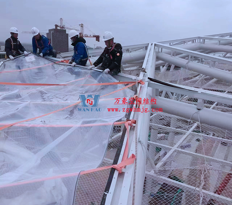 文一塘溪津門天幕鋼結構及ETFE氣枕膜工程由寧波萬豪空間結構工程有限公司承建,該項目用鋼量900噸,膜結構展開面積7000平米。今年以來,萬豪施工團隊緊抓時間節(jié)點,工程進度推進迅速。