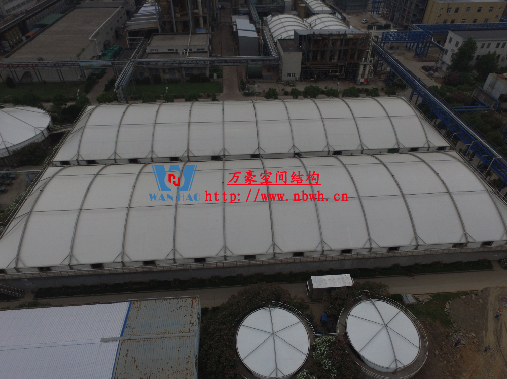 東廠區(qū)生化池膜結(jié)構(gòu)加蓋工程,坐落于浙江省紹興市杭州灣上虞經(jīng)濟(jì)開(kāi)發(fā)區(qū)龍盛科技園內(nèi)。整個(gè)項(xiàng)目由A/O池加蓋4座、二沉池加固定蓋4座、濃縮池加蓋2座、氧化池加蓋1座、氧化氣浮池加蓋1座、氧化集水池加蓋1座、出水調(diào)節(jié)池1座、安諾池1座,共計(jì)15座鋼膜結(jié)構(gòu)組成。總用鋼量達(dá)350噸,膜結(jié)構(gòu)展開(kāi)面積達(dá)35000平方米。